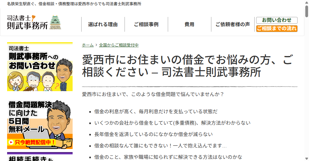 - 愛知県西部を中心に、債務整理や過払い金請求、自己破産などの法律サービスに特化した経験豊富な弁護士が、あなたの不安を解消します。