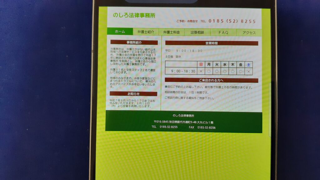 電話番号 | 0182-33-3238(法律事務所) 0182-38-8859(司法書士専用) |
