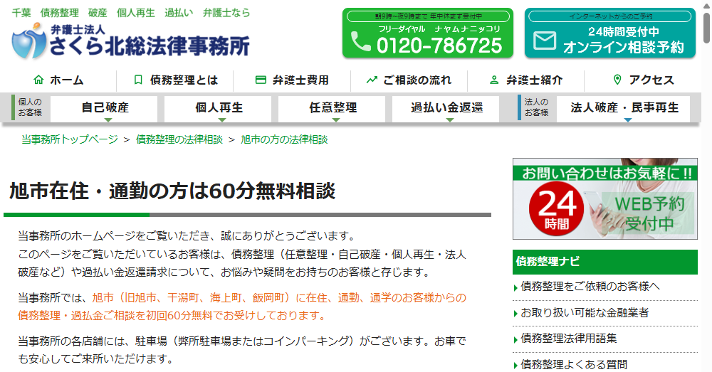 - 旭市に特化した弁護士法人さくら北総法律事務所は、債務整理や過払い金請求に関する無料相談を初回60分実施し、地域密着型の専門性で安心を提供します。