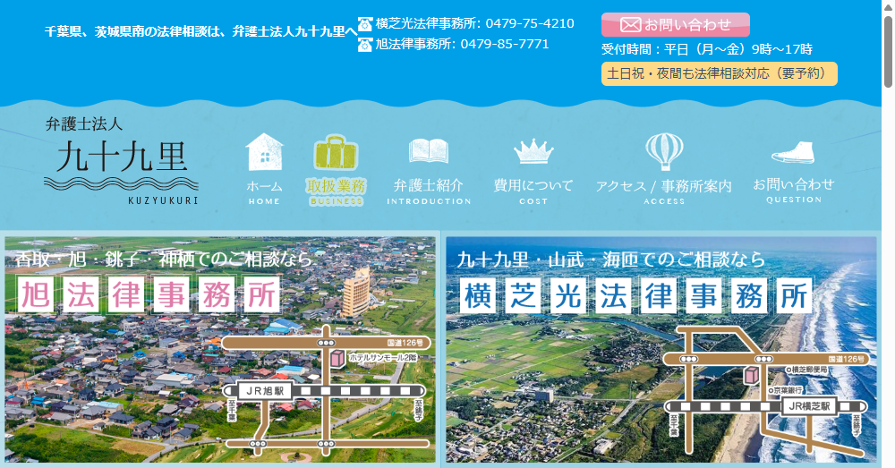 - 弁護士法人九十九里として地域に密着し、総合的な法律問題に対応。相談内容例としては、離婚や相続問題に特化し、多くの実績があります。