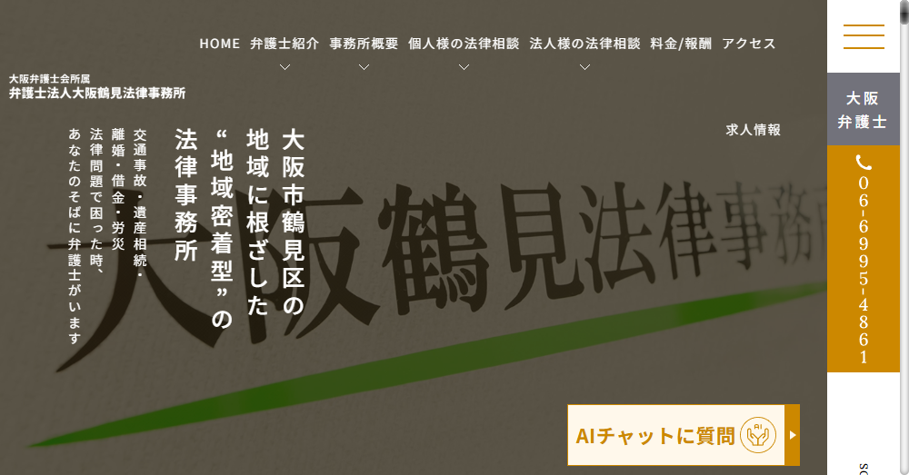 弁護士法人大阪鶴見法律事務所は大阪市鶴見区に位置する地域に根ざした法律事務所で、交通事故や遺産相続、離婚、借金、労災問題など幅広い法律相談を行っています。