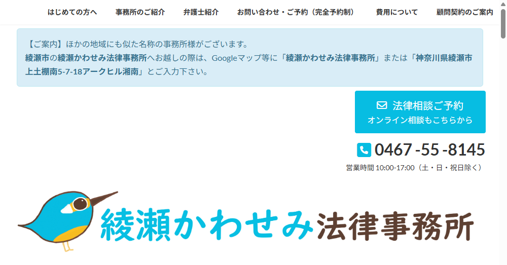 綾瀬かわせみ法律事務所は神奈川県綾瀬市に位置し、高齢者・家族・動物に関する法律問題を専門とする事務所です。