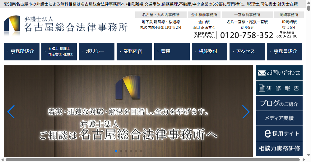 弁護士法人名古屋総合法律事務所は名古屋市を拠点に、相続、離婚、交通事故、債務整理、不動産、中小企業法務の6分野に特化した法律事務所です。