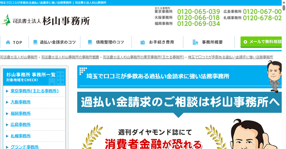 - 埼玉で口コミ多数の実績を誇る杉山事務所は、過払い金請求に特化し、多くの顧客から高評価を受けており、過去には週刊ダイヤモンドに「消費者金融が恐れる司法書士事務所」として選出されました。