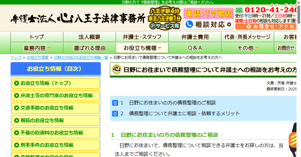 - 債務整理や相続、交通事故など多岐にわたる対応業務を持ち、地域に根ざした実績で八王子・日野のクライアントから高い信頼を獲得しています。