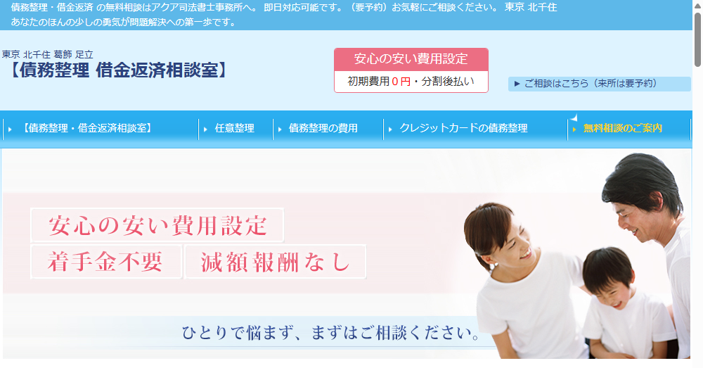 - 無料相談を提供するアクア司法書士事務所では、債務整理(任意整理)を通じて、借金の軽減をサポートし、初期費用が0円から始められます。