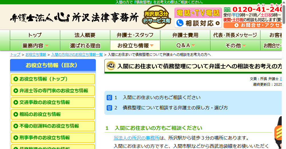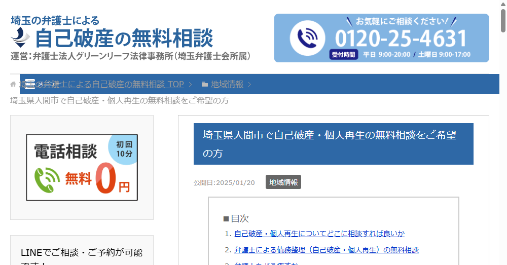 • 埼玉県入間市で35年以上の実績を持つグリーンリーフ法律事務所では、自己破産や個人再生に特化した無料相談を実施し、借金問題に悩む方に寄り添ったサポートを提供しています。