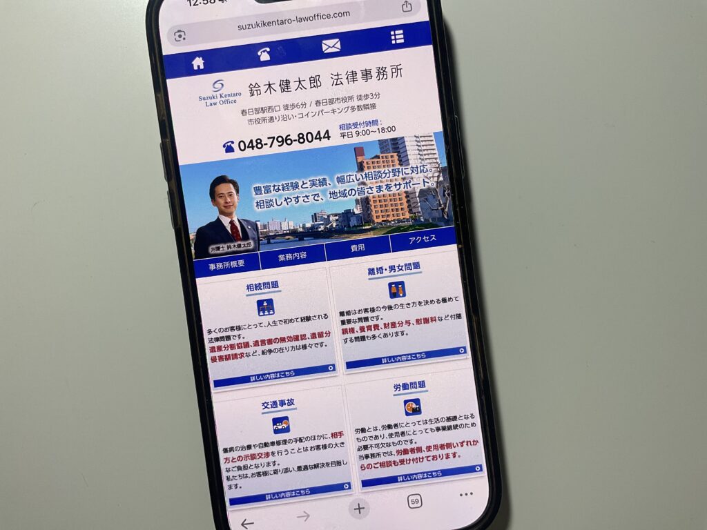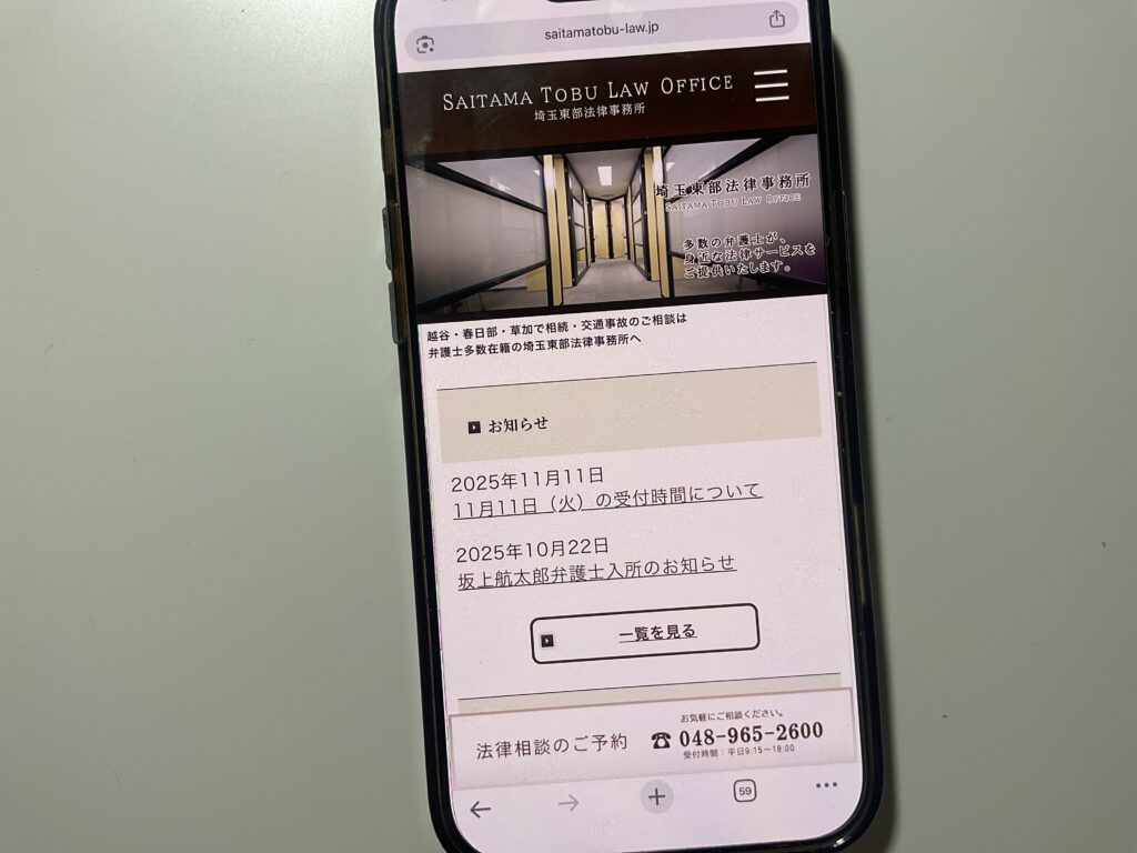 - 埼玉県東部地域を中心に、相続や債務整理、交通事故など幅広い法律問題に対応しており、法人・個人問わず安心して相談できる法律事務所です。
