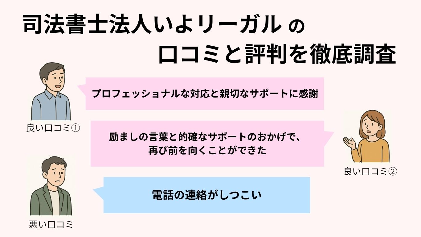 司法書士法人いよリーガルに債務整理を依頼しようか検討する際、実際に利用した人の声は非常に重要な判断材料となります。インターネット上には様々な口コミや評判が寄せられており、良い評価もあれば、厳しい意見も存在するのが実情です。