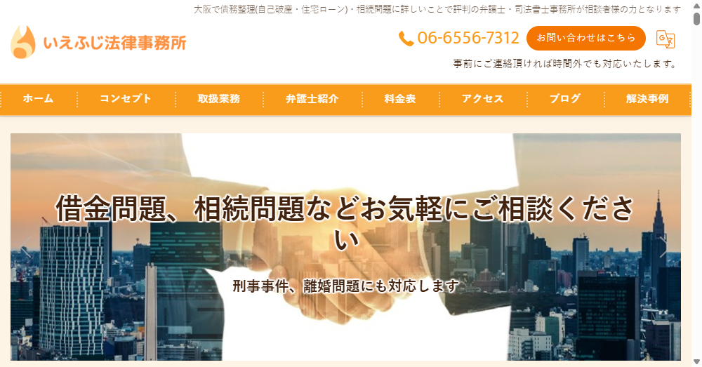 • 大阪の家藤法律事務所は、相続問題や債務整理に特化し、これまでに1,000件以上の解決実績を誇る、信頼の厚い法律事務所です。