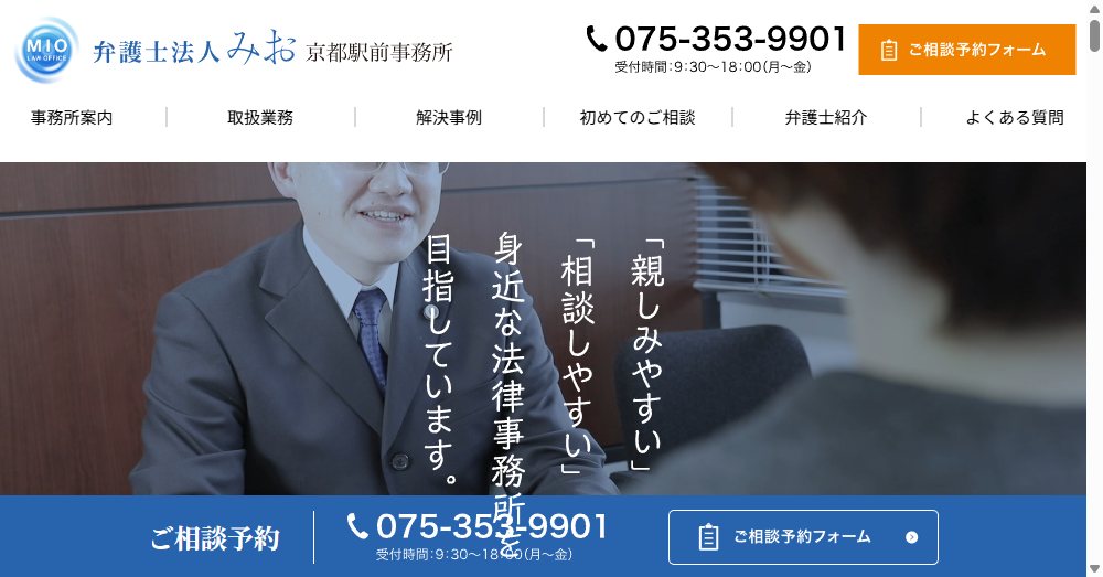 - JR京都駅から徒歩すぐの便利な立地。土日祝も営業し、23時まで対応しているため、忙しい方でもスムーズに相談できます。