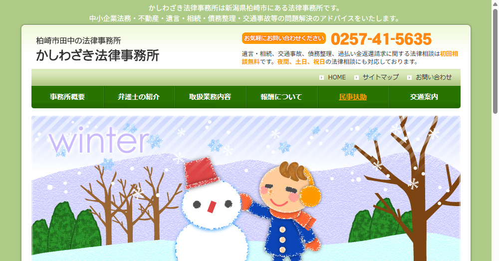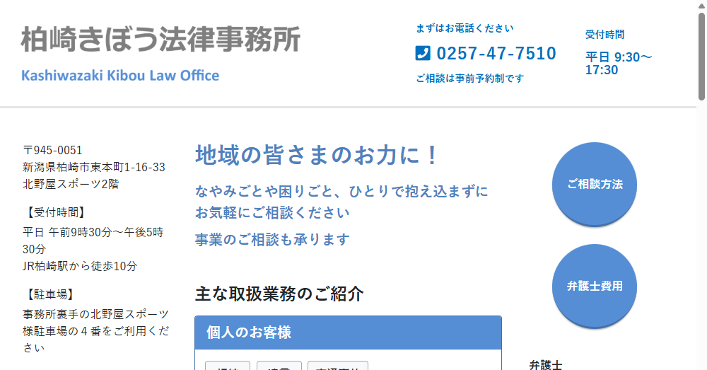 - 新潟県柏崎市に根ざした法律事務所として、地域密着のきめ細やかなサービスを提供し、顧客満足度の向上に努めています。