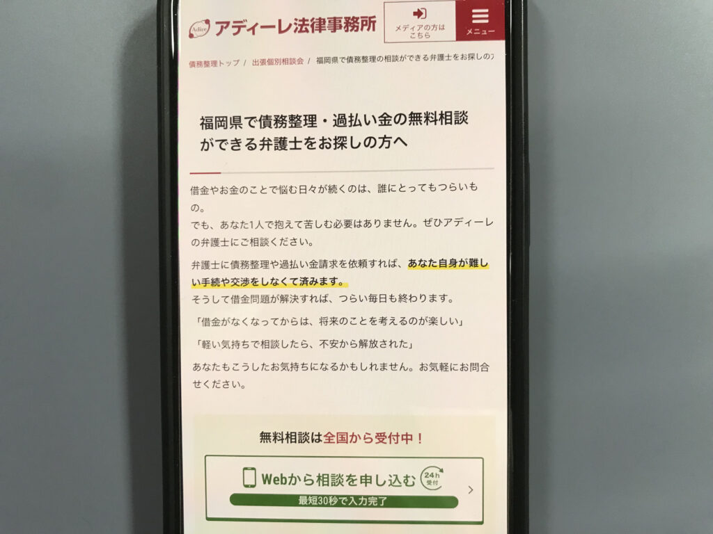 - 無料電話相談を1時間以上丁寧に対応し、借金問題の解決や過払い金返還請求、自己破産・個人再生など幅広い債務整理を福岡市赤坂駅徒歩1分の好立地で対応しています。