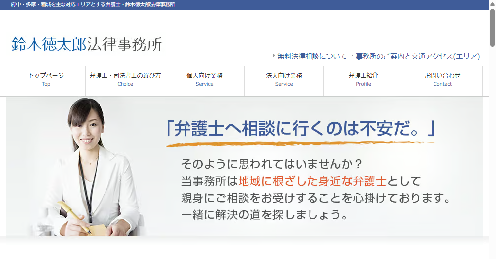 - 地域密着型の法律相談所として、府中市・多摩地域で30年以上の経験を持つ弁護士が、相続問題や債務整理などの個人向け案件を多数手掛けています。