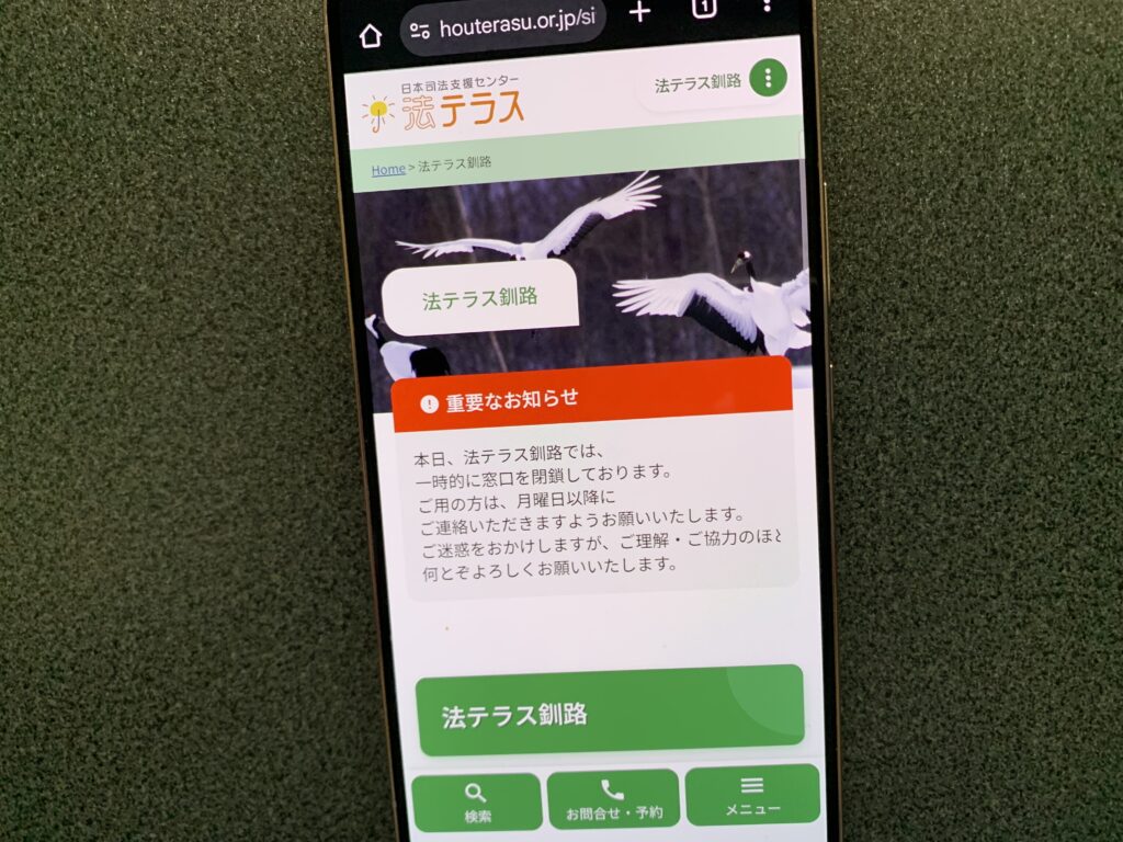 - 法テラス釧路では、借金や離婚、相続問題などの法律相談を専門とし、無料法律相談を通じて地域の法的支援を提供しています。