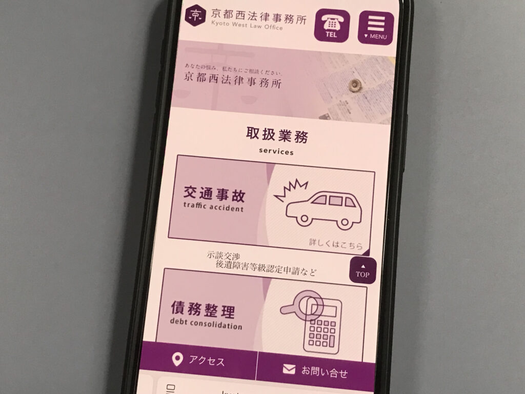 交通事故、債務整理、遺言・相続、離婚、労働問題、不動産、刑事事件、企業法務など幅広く対応。 | 裁判での示談金増額実績や、生活保護利用者の自己破産対応など具体的な解決事例が公式サイトに掲載されている。 | 平日夜9時まで、土日祝日も事前予約で相談可能。 | 来所、電話(交通事故、遺言・相続のみ) | 京都府京都市右京区西院平町25 ライフプラザ西大路四条7階 最寄駅: 阪急・京福(嵐電)西院駅近く |