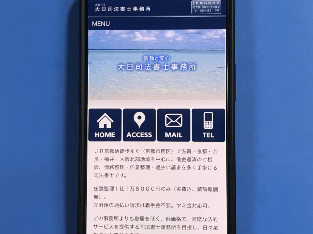 大日司法書士事務所 | 公式サイト | ・初回相談料: 回数、時間、方法を問わず完全無料 ・着手金: 不要 ・成功報酬: 減額報酬は不要。任意整理1件18,000円(実費込)など明確な料金設定。 |