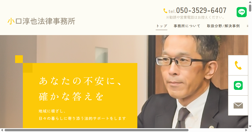 | 対応可能業務 | 不動産の売買・賃貸借、相続・遺産分割・遺言書、交通事故、企業法務・労働問題・知的財産、債権回収及び債務整理、刑事弁護活動 |