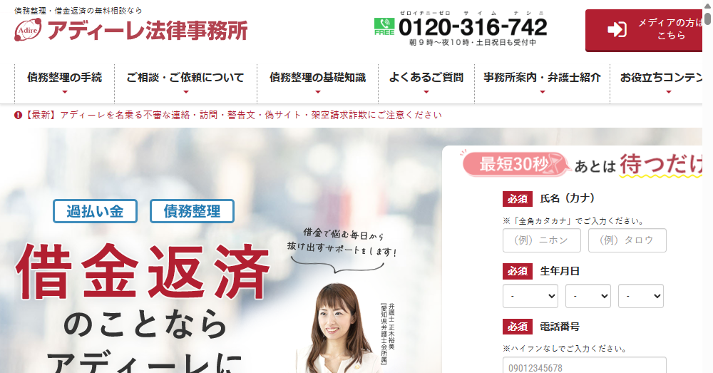 弁護士法人アディーレ法律事務所は全国に65拠点を展開し債務整理の専門事務所として確固たる地位を築いています。