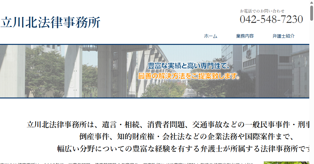 - 相続、債務整理、企業法務など多様な法的業務を扱い、豊富な実績を持つ弁護士が直接支援。地域の皆様に信頼される法律サービスを提供し、高い顧客満足度を誇ります。
