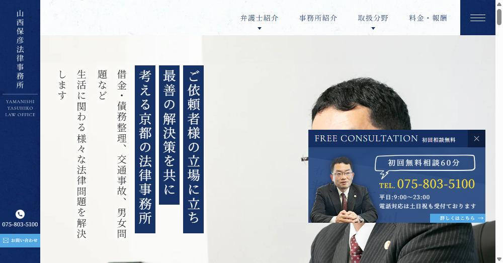 - 初回60分の無料相談で、遺産相続や借金問題など生活に密着した法律トラブルにしっかり対応。安心して法律相談ができる環境を提供しています。