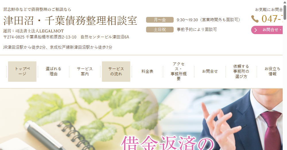 津田沼・千葉債務整理相談室は習志野市を中心に債務整理を専門とする司法書士法人LEGALMOTが運営する事務所です。