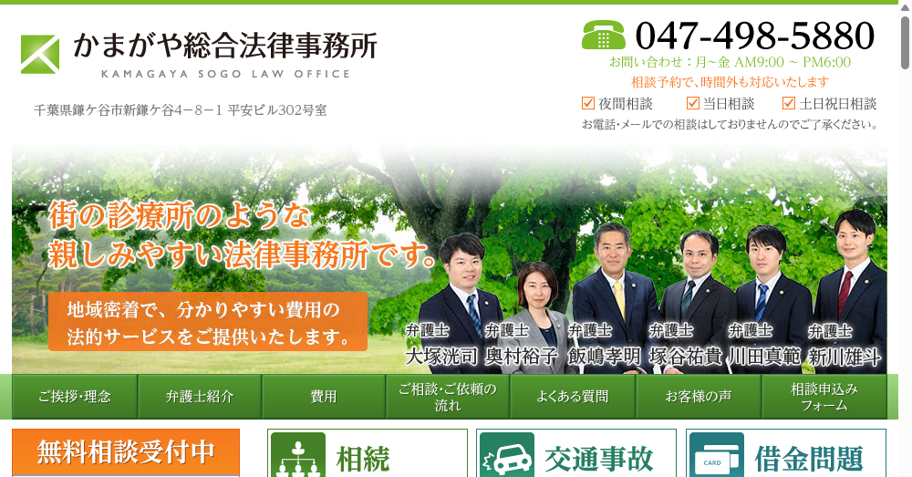 - 初回相談無料で、気軽に法律相談ができる「かまがや総合法律事務所」は、地域密着型の親しみやすい法律サービスを提供し、6,080件以上の相談実績を誇ります。