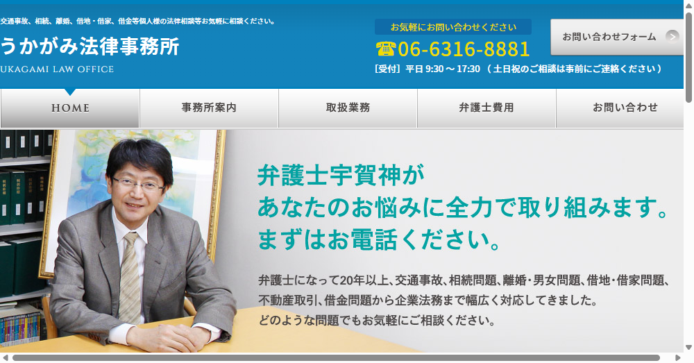 うかがみ法律事務所は大阪市北区に位置し、交通事故、相続、離婚、借地・借家、借金問題など多様な法律相談を提供する専門事務所です。