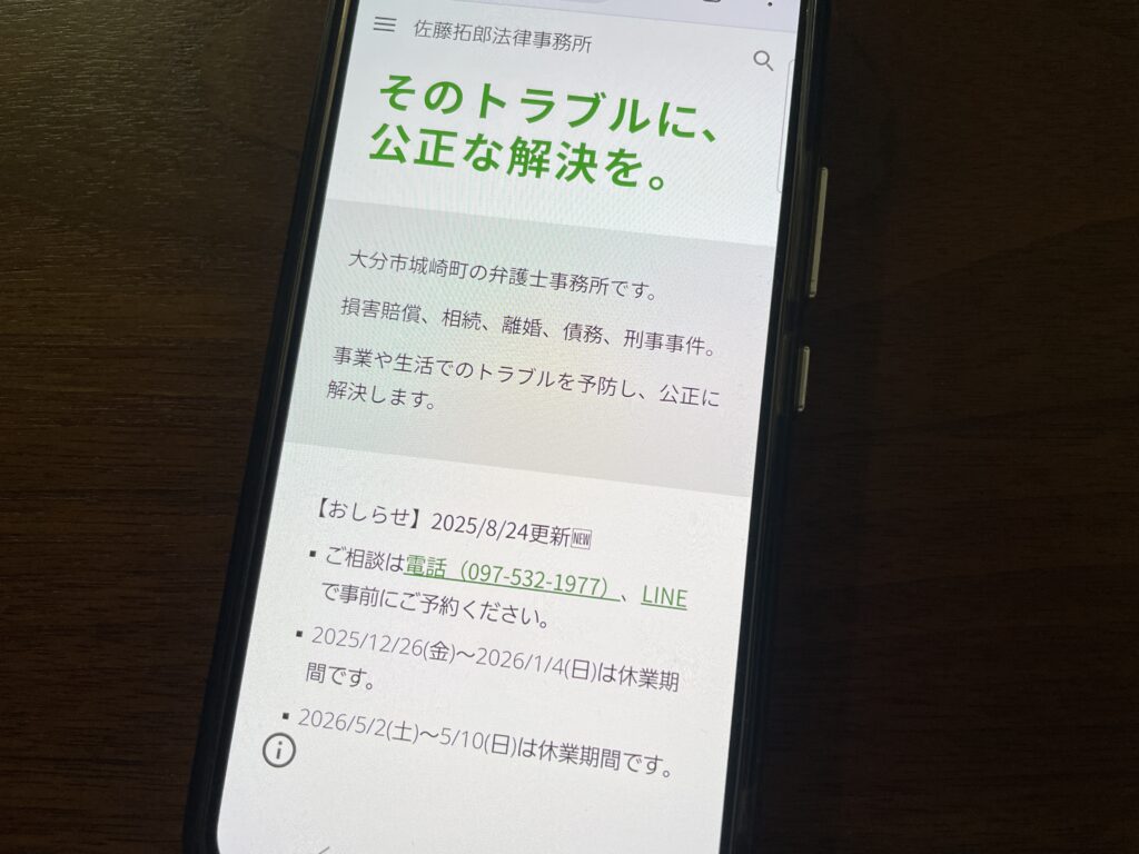 - 初回無料相談(1時間程度)を借金問題・相続・交通事故分野で実施し、大分県内で気軽に法律相談できる窓口を提供しています。