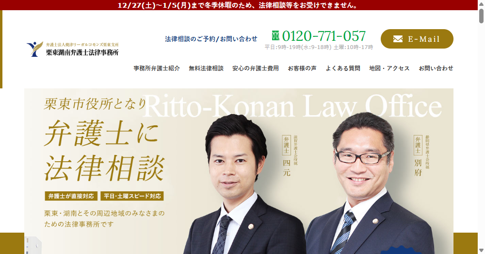 • 栗東・湖南地域に特化した地域密着型の法律事務所で、交通事故や債務整理、遺産相続など幅広い業務に対応し、迅速かつ丁寧にサポートします。