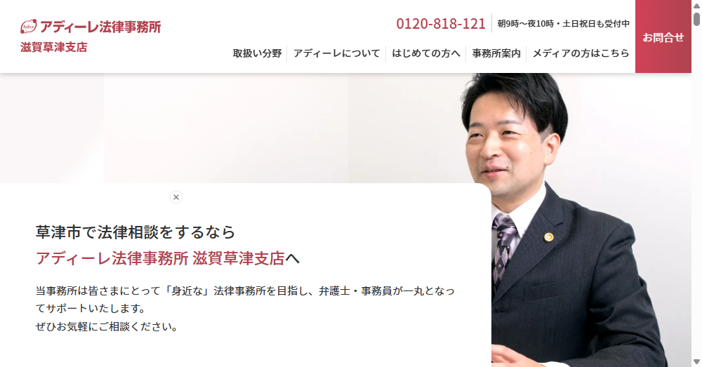 アディーレ法律事務所 滋賀草津支店は、地域の皆様に信頼性の高い法律サービスを提供するため、多様な法律ニーズに応えています。