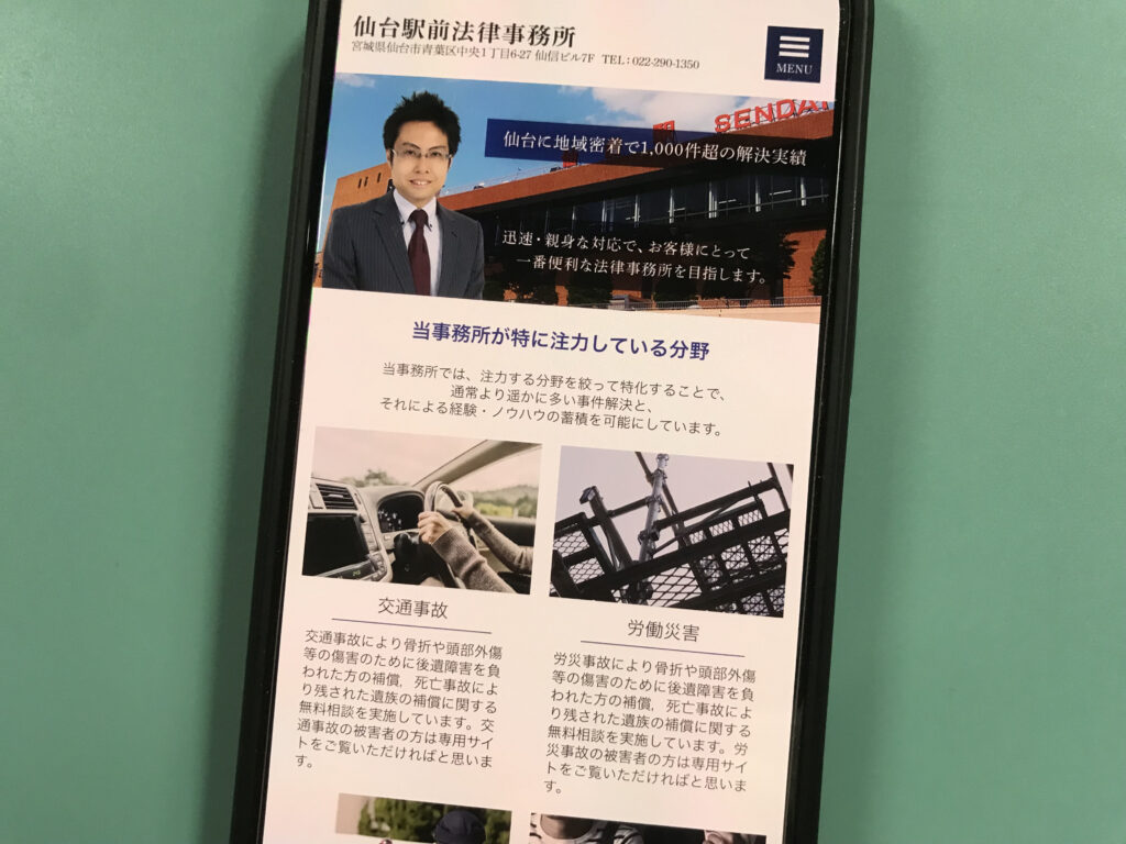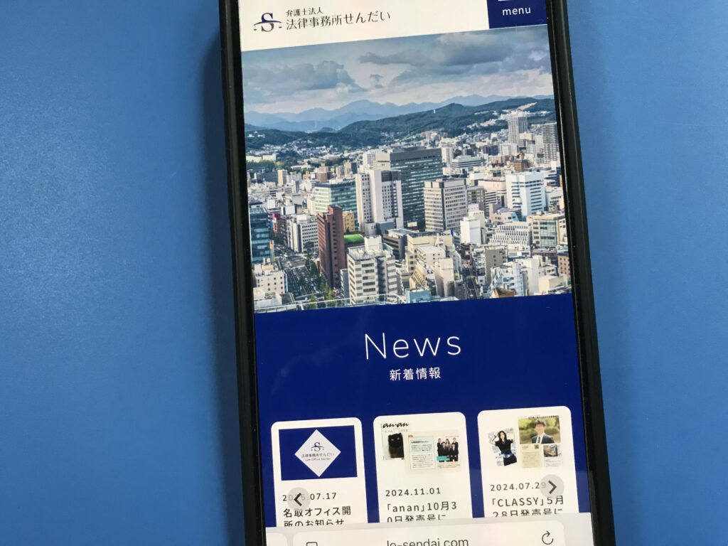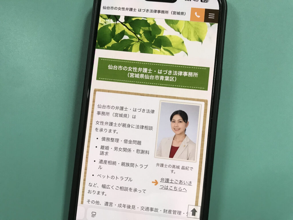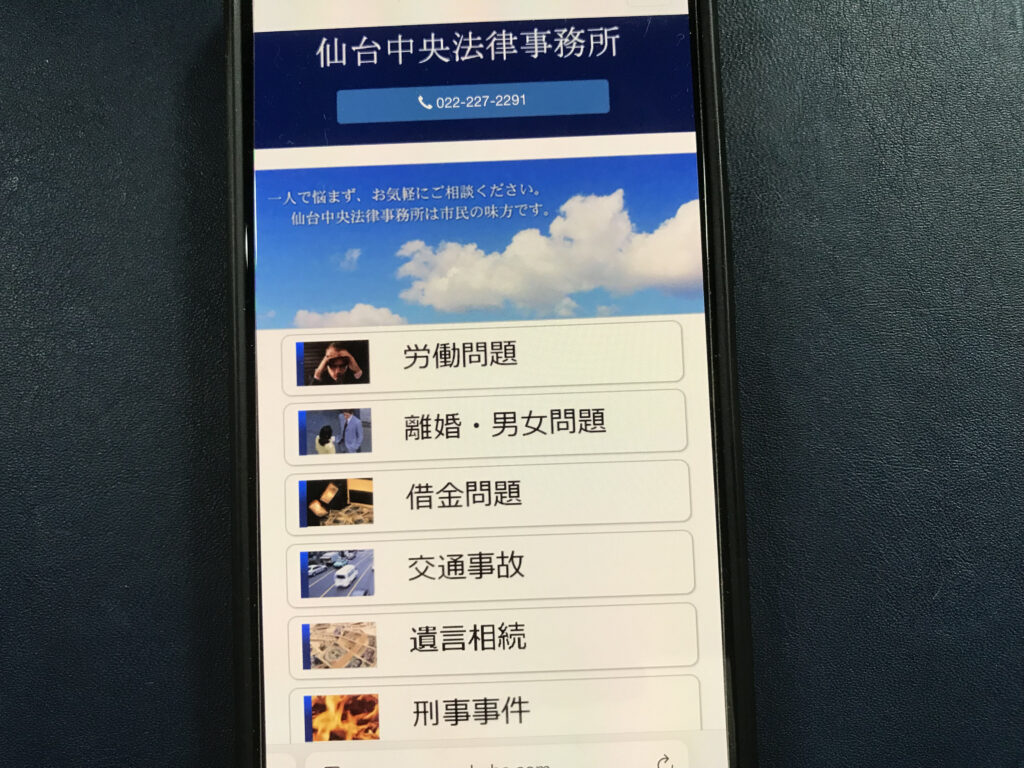 - 仙台市青葉区に拠点を置き、初回無料のオンライン・メール法律相談を提供し、交通事故や離婚・相続、企業法務など幅広い分野に対応。