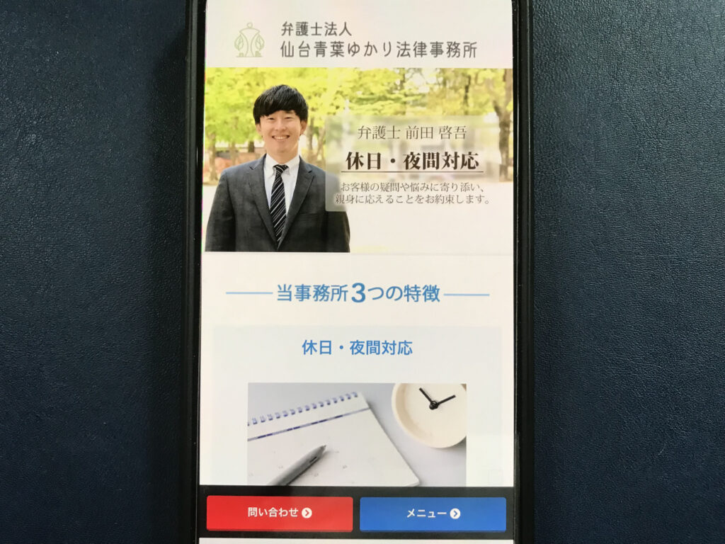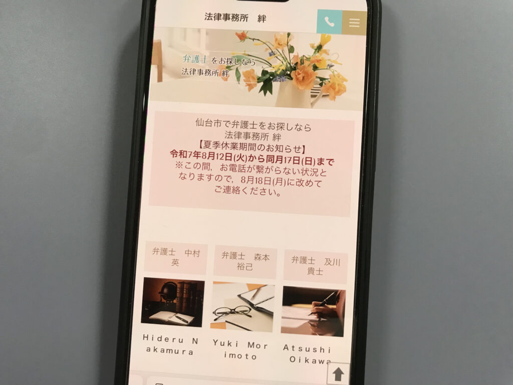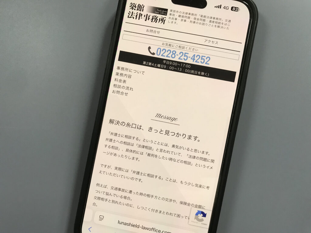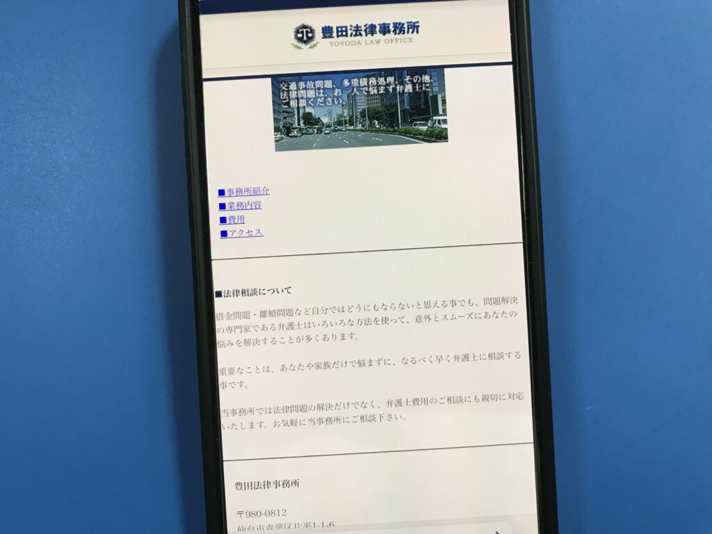 - 仙台市青葉区に拠点を置き、初回無料のオンライン・メール法律相談を提供し、交通事故や離婚・相続、企業法務など幅広い分野に対応。