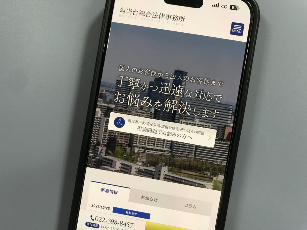 - 仙台駅徒歩7分の利便性に優れた立地で、離婚・相続・交通事故など幅広い法律相談を対面・オンラインで対応し、地域密着で東北6県にサービス提供しています。