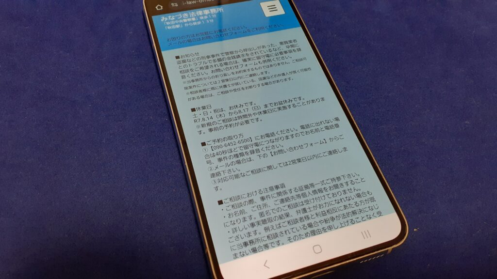 - 警察からの呼出しを受けた刑事事件や、詐欺による金銭トラブルなど緊急性の高いご相談にも迅速に対応。秋田中央警察署から徒歩1分の立地も強みです。