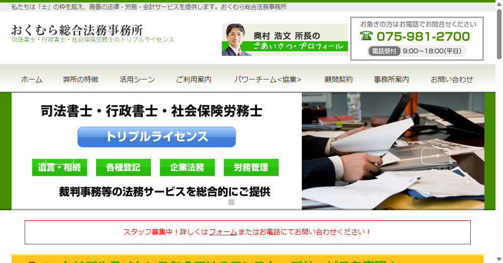 おくむら総合法務事務所は、トリプルライセンスを持つ法律専門家が幅広い法律・労務・会計サービスを提供しています。