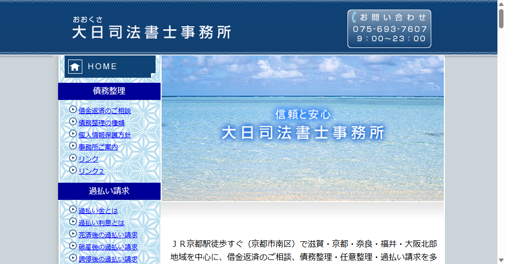 大日司法書士事務所は京都市南区東九条室町に位置し、京都、滋賀、奈良、福井地域を中心に債務整理や過払い請求を専門に受け付けています。