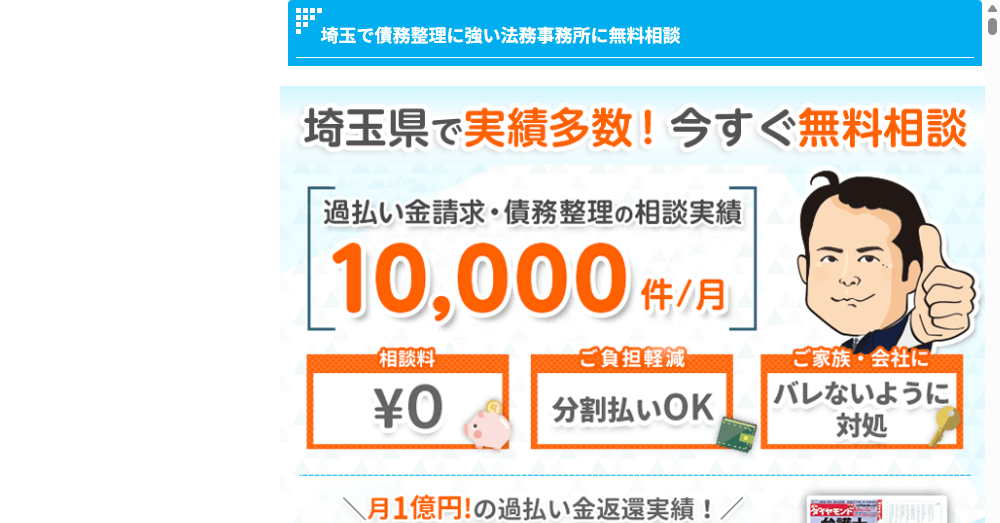• 埼玉全域対応の無料相談を通じて、債務整理や借金減額に特化したサービスを提供し、一人一人に最適な解決策を迅速に案内します。
